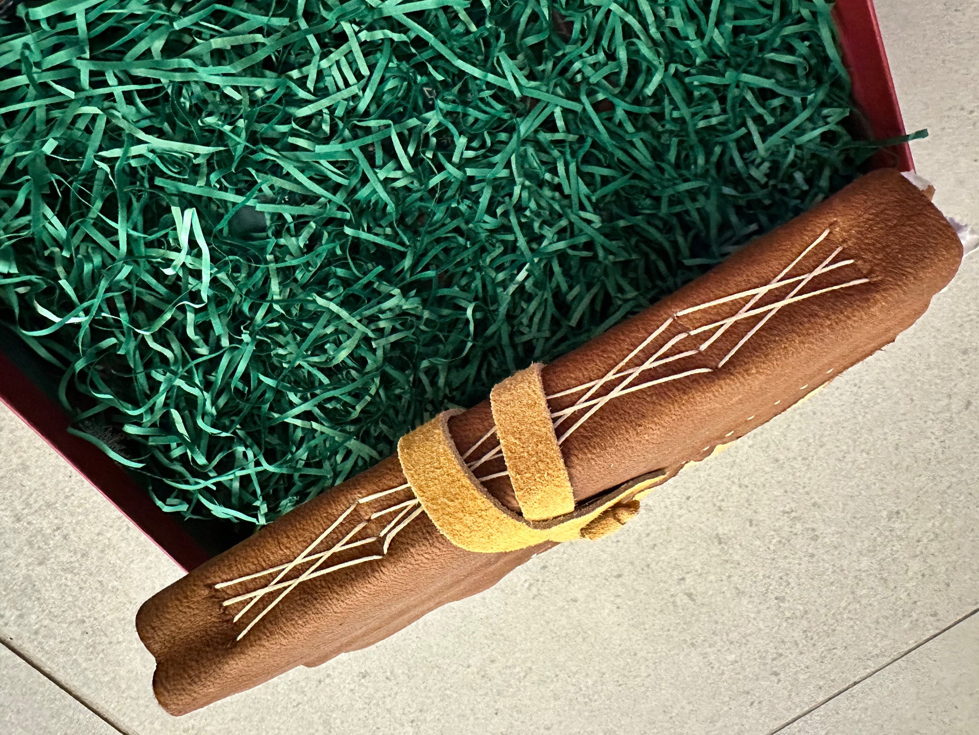 Handmade moose hide leather journal with handmade paper featuring deckled edge, acid-free pages and includes a storage box and cotton bag. One of a kind.