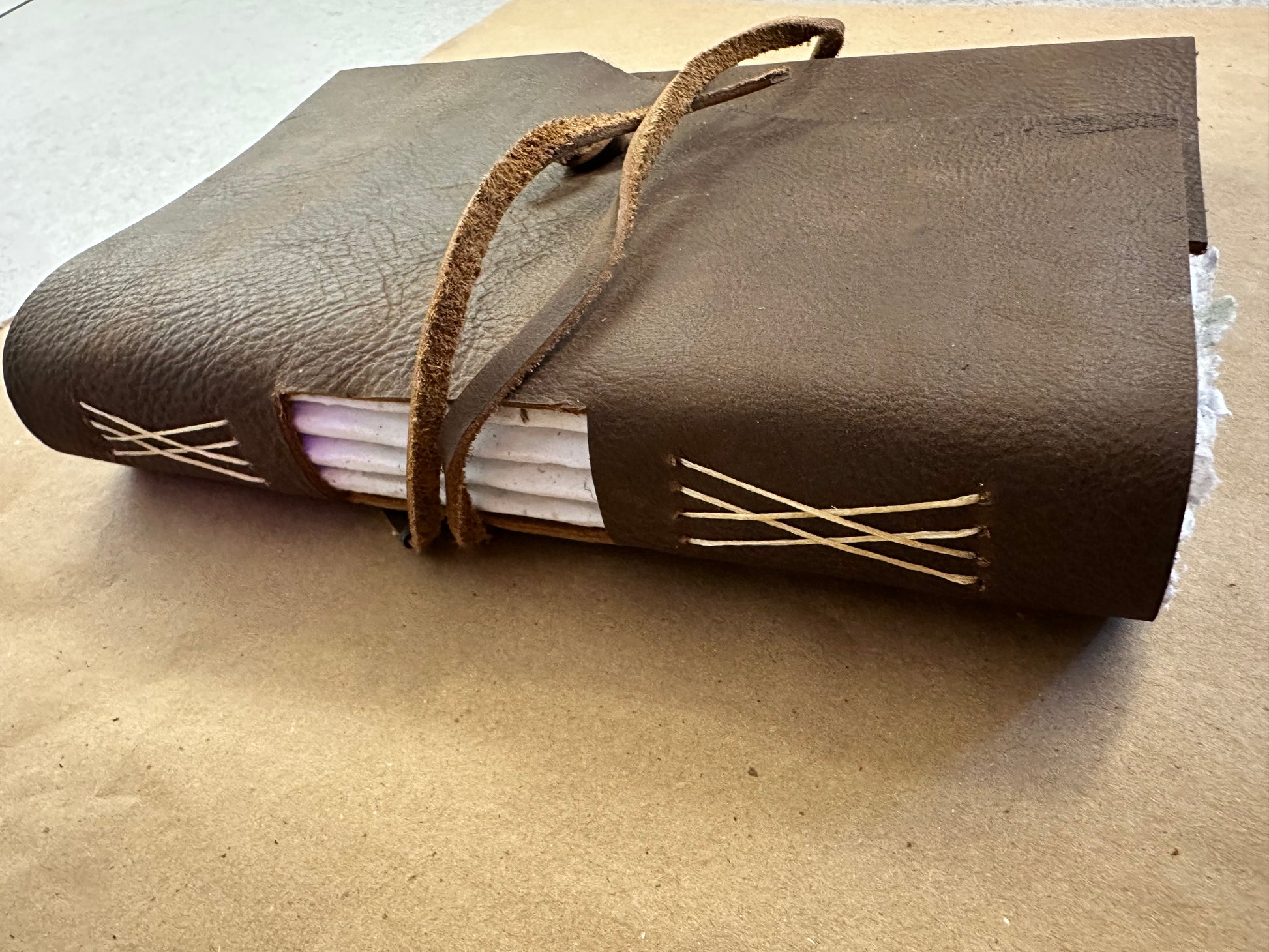 This handmade leather journal measures approximately 6"x 9".