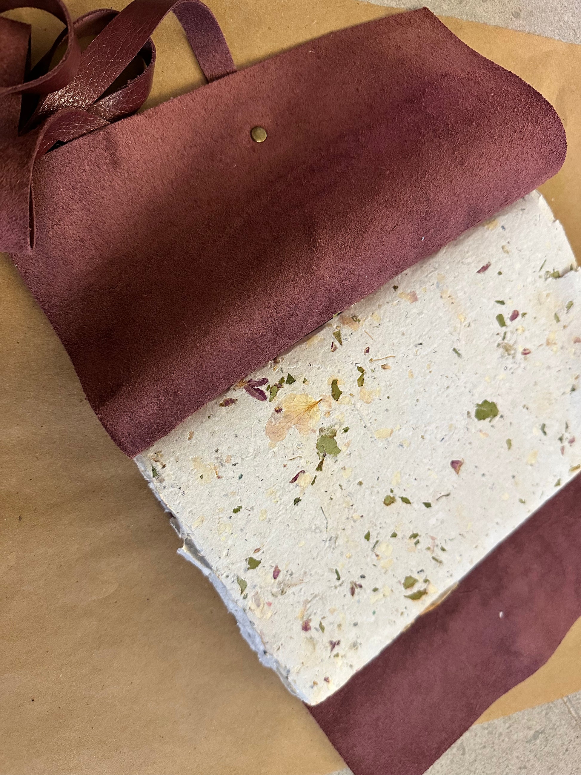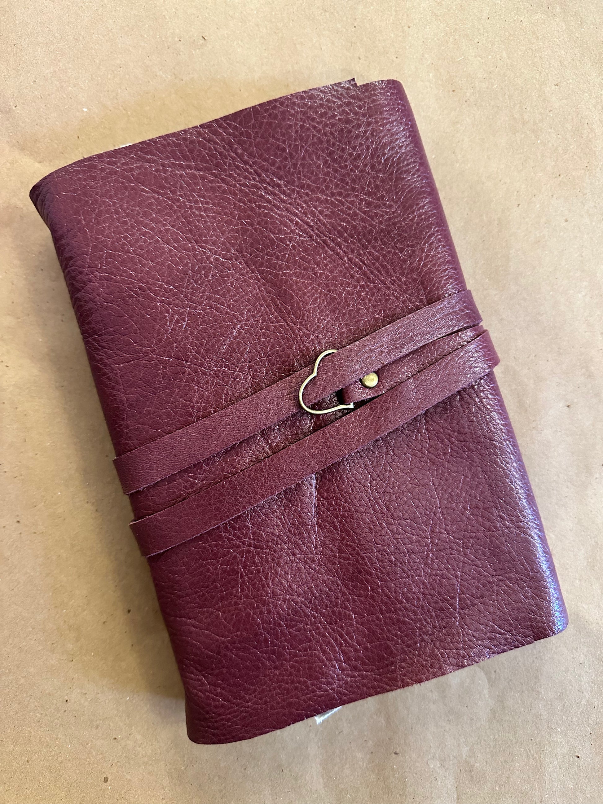 This handmade leather journal measures approximately 6"x 9".