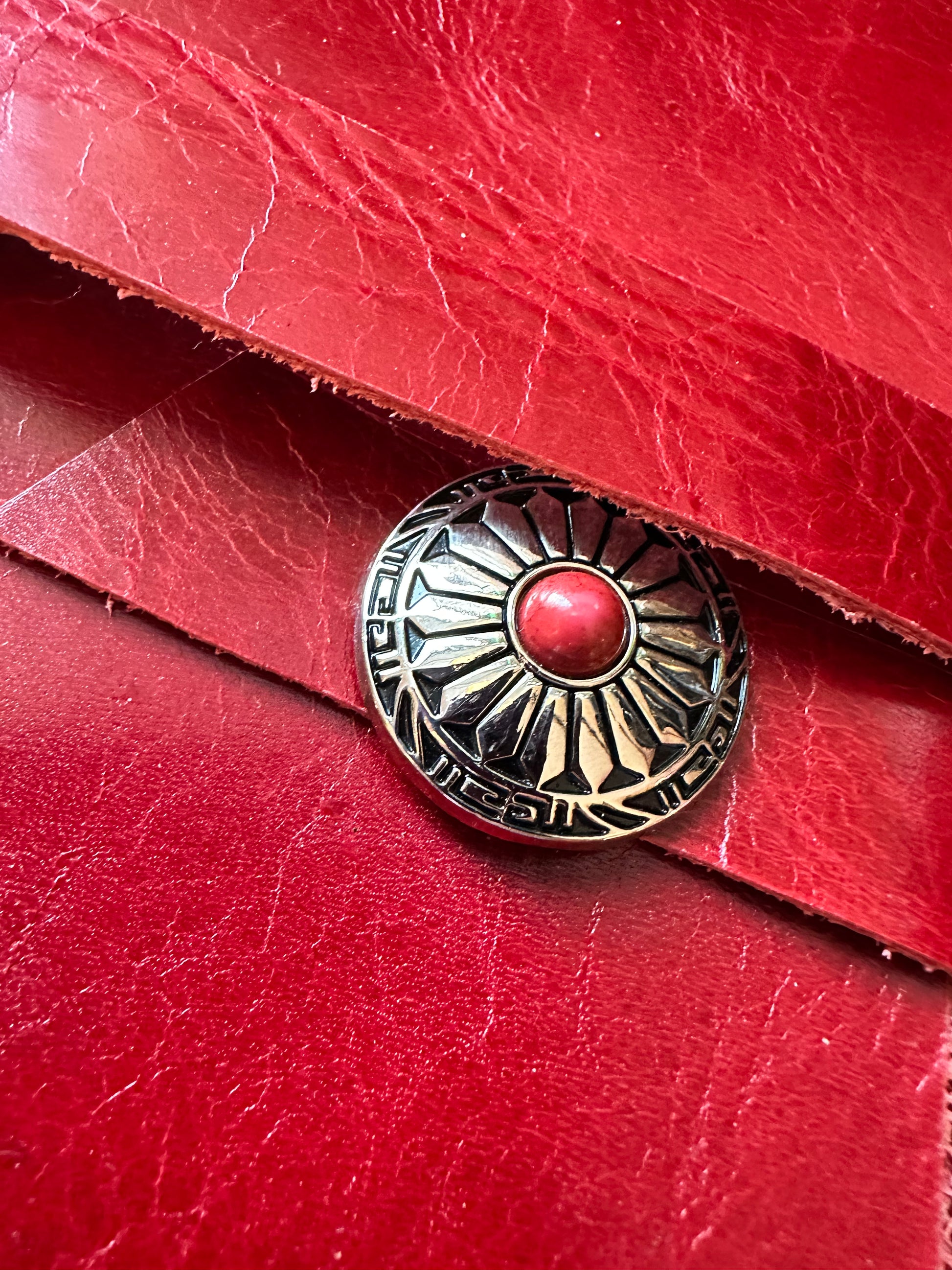 This handmade leather journal measures approximately 6"x 9".